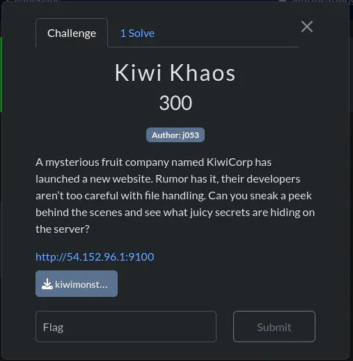This was a relatively simple web challenge, where I got first blood and ended up being the sole solver. I was rather surprised that other teams did not manage to solve it. For this challenge, we were provided with an archive kiwimonster.zip containing the challenge files. Extracting the provided archive, we can see the following files which allow us to set up the challenge locally.