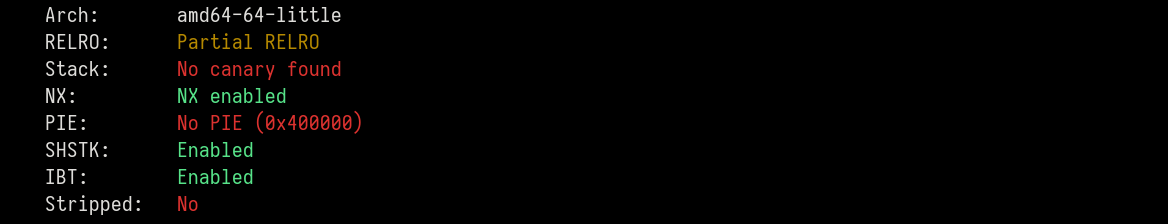 The binary also has the following protections with PIE being disabled.