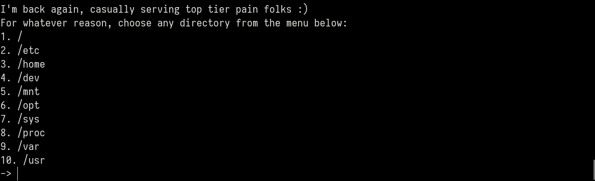 target.sendlineafter(b'-> ',b'3') # pick directory