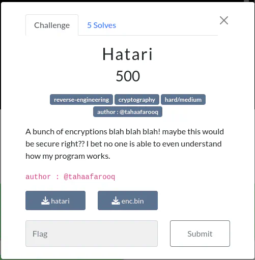 This challenge is a Hard rated reverse engineering challenge. Before even going any further, my approach for solving this challenge was not the intended one, but regardless, the end justifies the means. In this challenge , we are provided with two files, the hatari elf binary and a enc.bin containing the encrypted flag , which is encrypted using the binary.